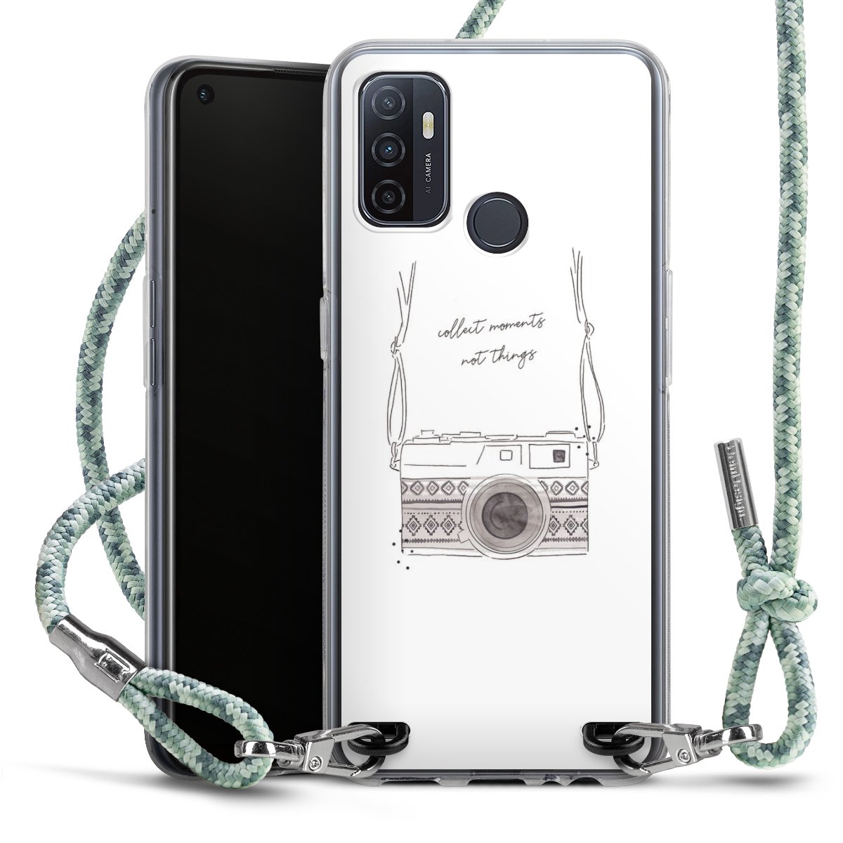 The flexible case is made from a highquality TPU material (thermoplastic Polyurethan). Thanks to its longlasting and break resistant characterisitcs, the case is flexible yet consistent in form and has a great grip and feel. The textile strap made from Polyester gives a chic yet casual accent allowing you to carry your phone like a bag or necklace - a practical gadget perfect for your next adventure. The textile strap is about 1.70 meters long and the length can easily be adjusted through the knots. Our Carry Case is available in Colourful, Mint-Camouflage, Very-Berry, Sahara-Sand and Sparkling-Neon. The ends of the textile strap are covered with metallic end caps to protect them against fraying.