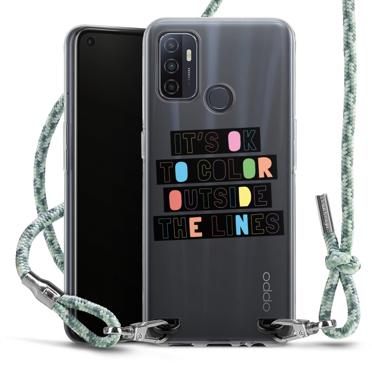 The flexible case is made from a highquality TPU material (thermoplastic Polyurethan). Thanks to its longlasting and break resistant characterisitcs, the case is flexible yet consistent in form and has a great grip and feel. The textile strap made from Polyester gives a chic yet casual accent allowing you to carry your phone like a bag or necklace - a practical gadget perfect for your next adventure. The textile strap is about 1.70 meters long and the length can easily be adjusted through the knots. Our Carry Case is available in Colourful, Mint-Camouflage, Very-Berry, Sahara-Sand and Sparkling-Neon. The ends of the textile strap are covered with metallic end caps to protect them against fraying.