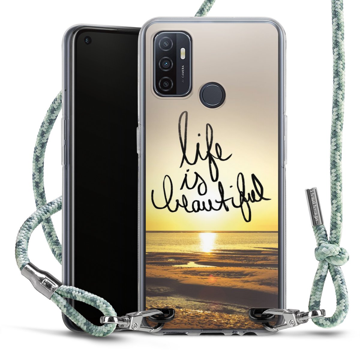 The flexible case is made from a highquality TPU material (thermoplastic Polyurethan). Thanks to its longlasting and break resistant characterisitcs, the case is flexible yet consistent in form and has a great grip and feel. The textile strap made from Polyester gives a chic yet casual accent allowing you to carry your phone like a bag or necklace - a practical gadget perfect for your next adventure. The textile strap is about 1.70 meters long and the length can easily be adjusted through the knots. Our Carry Case is available in Colourful, Mint-Camouflage, Very-Berry, Sahara-Sand and Sparkling-Neon. The ends of the textile strap are covered with metallic end caps to protect them against fraying.