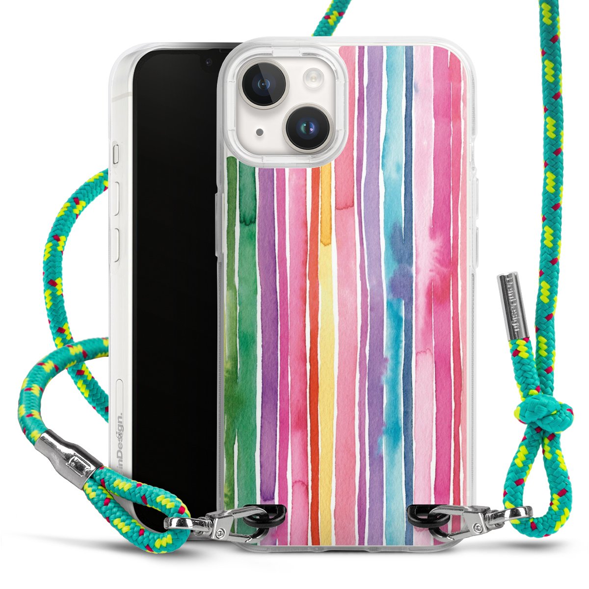 The flexible case is made from a highquality TPU material (thermoplastic Polyurethan). Thanks to its longlasting and break resistant characterisitcs, the case is flexible yet consistent in form and has a great grip and feel. The textile strap made from Polyester gives a chic yet casual accent allowing you to carry your phone like a bag or necklace - a practical gadget perfect for your next adventure. The textile strap is about 1.70 meters long and the length can easily be adjusted through the knots. Our Carry Case is available in Colourful, Mint-Camouflage, Very-Berry, Sahara-Sand and Sparkling-Neon. The ends of the textile strap are covered with metallic end caps to protect them against fraying.