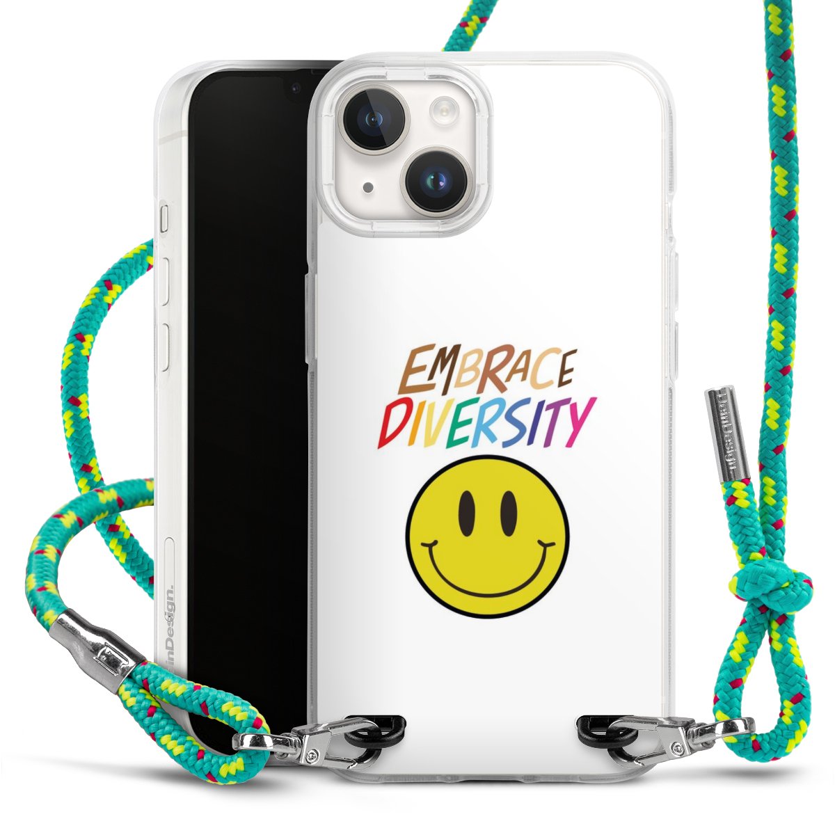 The flexible case is made from a highquality TPU material (thermoplastic Polyurethan). Thanks to its longlasting and break resistant characterisitcs, the case is flexible yet consistent in form and has a great grip and feel. The textile strap made from Polyester gives a chic yet casual accent allowing you to carry your phone like a bag or necklace - a practical gadget perfect for your next adventure. The textile strap is about 1.70 meters long and the length can easily be adjusted through the knots. Our Carry Case is available in Colourful, Mint-Camouflage, Very-Berry, Sahara-Sand and Sparkling-Neon. The ends of the textile strap are covered with metallic end caps to protect them against fraying.