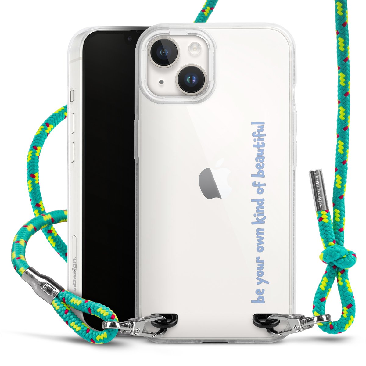 The flexible case is made from a highquality TPU material (thermoplastic Polyurethan). Thanks to its longlasting and break resistant characterisitcs, the case is flexible yet consistent in form and has a great grip and feel. The textile strap made from Polyester gives a chic yet casual accent allowing you to carry your phone like a bag or necklace - a practical gadget perfect for your next adventure. The textile strap is about 1.70 meters long and the length can easily be adjusted through the knots. Our Carry Case is available in Colourful, Mint-Camouflage, Very-Berry, Sahara-Sand and Sparkling-Neon. The ends of the textile strap are covered with metallic end caps to protect them against fraying.